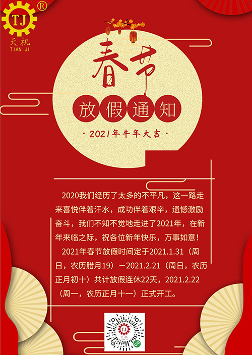 東莞市臺機減速機有限公司天機傳動2021年牛年春節放假通知如下
